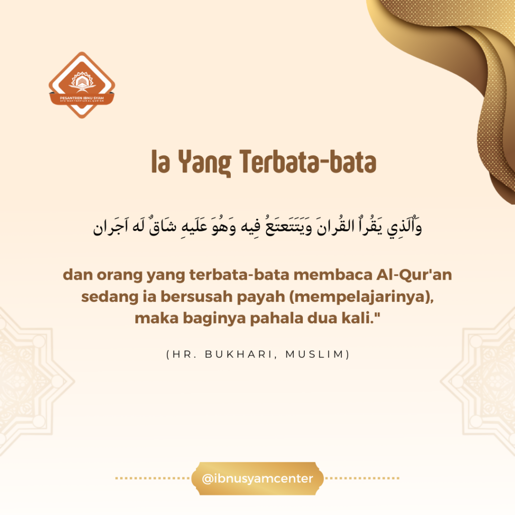“Seorang yang lancar membaca al-Quran akan bersama para malaikat yang mulia dan senantiasa selalu taat kepada Allah, dan orang yang terbata-bata membaca al-Qur’an sedang ia bersusah payah (mempelajarinya), maka baginya pahala dua kali.”