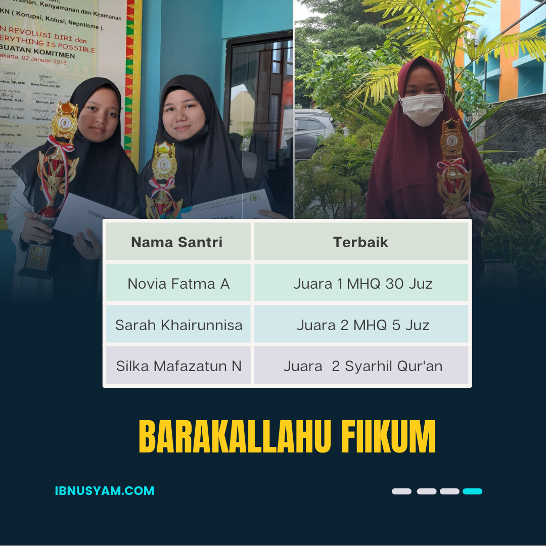 Alhamdulillah 10 Santri Pesantren Ibnu Syam berhasil meraih Juara Pada Musabaqah Hifdzil Qur’an Tingkat Kec. Purwakarta Kafilah Kotabumi Tahun 2022.